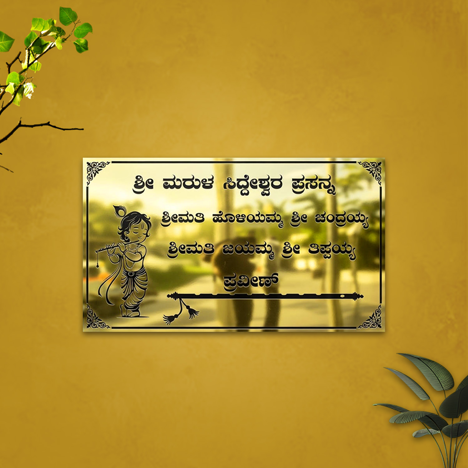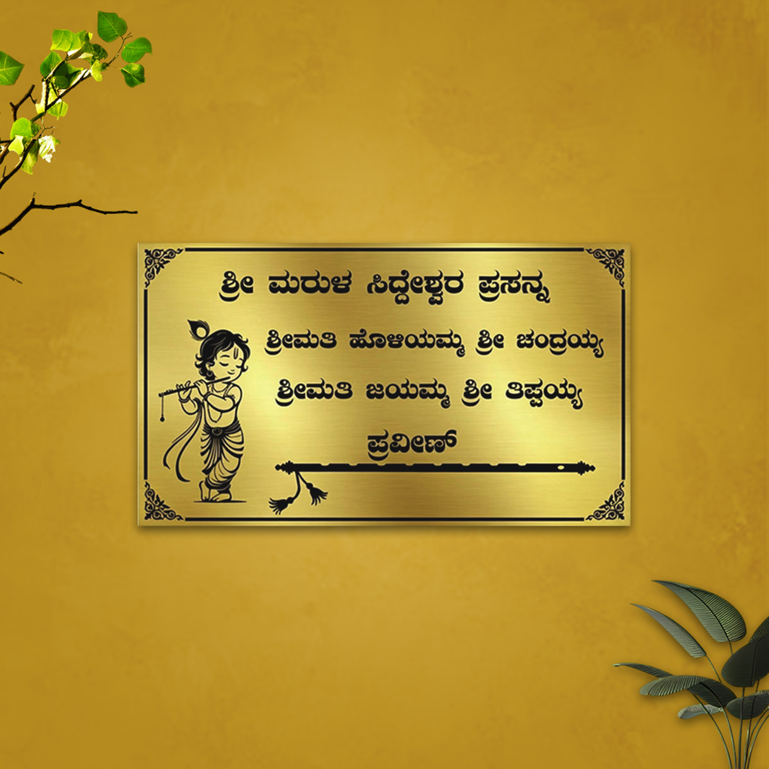 Personalized Kannada Nameplate with Krishna Motif – Gold Metallic Finish